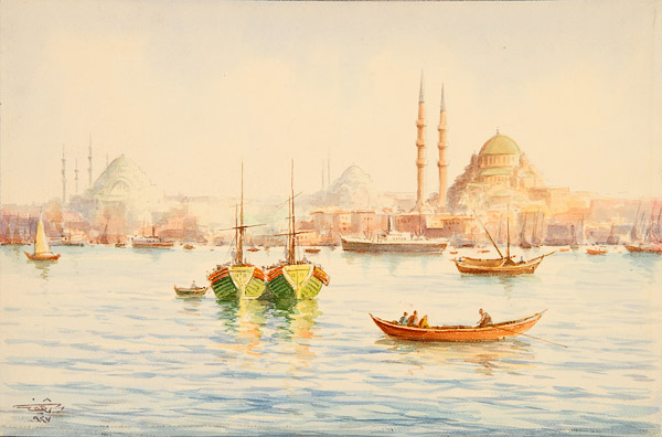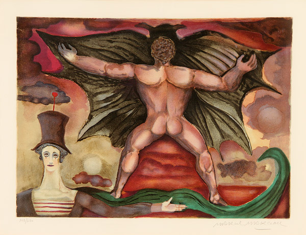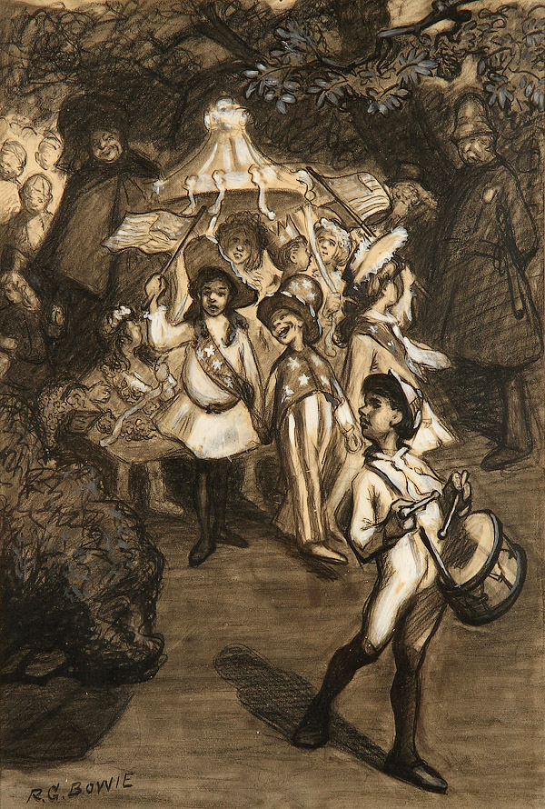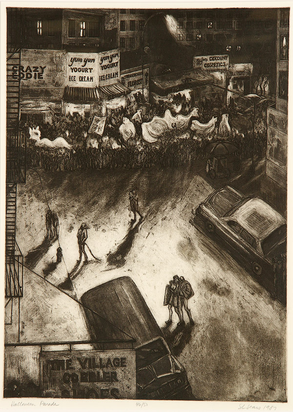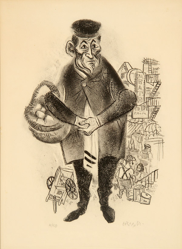 A GROUP OF FOUR FRAMED ARTWORKS, CIRCA 1915-1980. Comprising a lovely charcoal and gouache illustration depicting Children in a 4th of July Procession in a New York City Park, signed lower left R.G. Bowie and inscribed, titled and dated on verso Robert G. Bowie 1915, 16 inches x 10.75 inches. Also, an original signed and numbered lithograph by American artist Chaim Gross (1904-1991) depicting a Jewish Man Holding Basket of Bread, 16.5 inches x 12 inches, an original hand signed and numbered color lithograph by the famous French pantomimist Marcel Marceau (1923-2007) image #4 from the series Le Troisome Oeil, 17 inches x 22.75 inches, and a highly accomplished signed and numbered etching and aquatint by American artist Sara Sears (Born 1953-) titled Halloween Parade –dated 1987, 21.75 inches x 15.75 inches, and a View of Constantinople, circa 1920, probably Italian, indistinguishably signed lower left, 10.75 inches x 16.25 inches (27.3 x 41.3 cm).