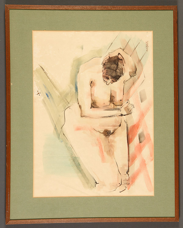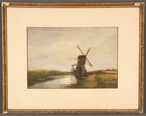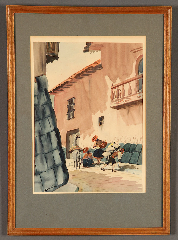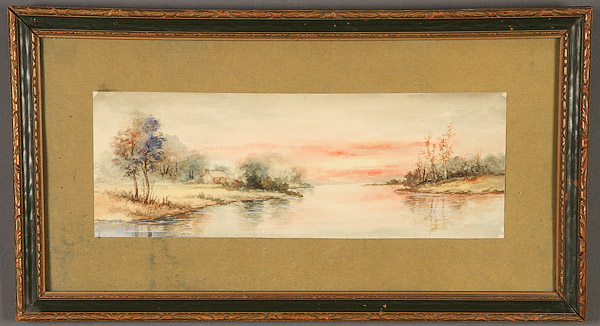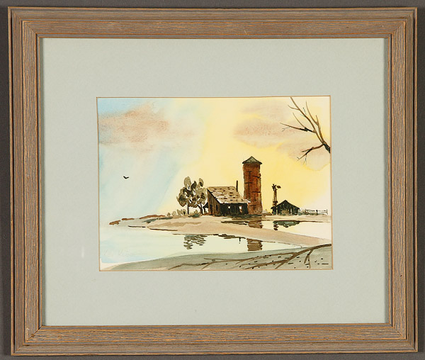 A GROUP OF SIX VINTAGE WATERCOLORS, CIRCA 1890-1950, EUROPEAN AND AMERICAN. Comprising a Landscape with Windmill, probably French, signed lower right Gabriel H., 10.2 inches x 15.5 inches (25.9 x 39.4 cm); Peruvian School (20th century) Street View with Figures and a Llama, indistinguishably signed lower left, 12 inches x 8.75 inches (30.5 x 22.2 cm); American School (circa 1890) River in Countryside at Sunset, apparently unsigned, 6 inches x 16.5 inches (15.2 x 41.9 cm); Ken Kline, Farm After the Storm, signed lower left, 5.6 inches x 7.5 inches (14.2 x 19 cm); Female Nude Resting on Her Side, signed lower right Webier, 15.75 inches x 22 inches (40 x 55.9 cm) and a Chinese Red, Pink and White Flowers in Vase on silk, 11.5 inches x 9.75 inches (29.2 x 24.8 cm).