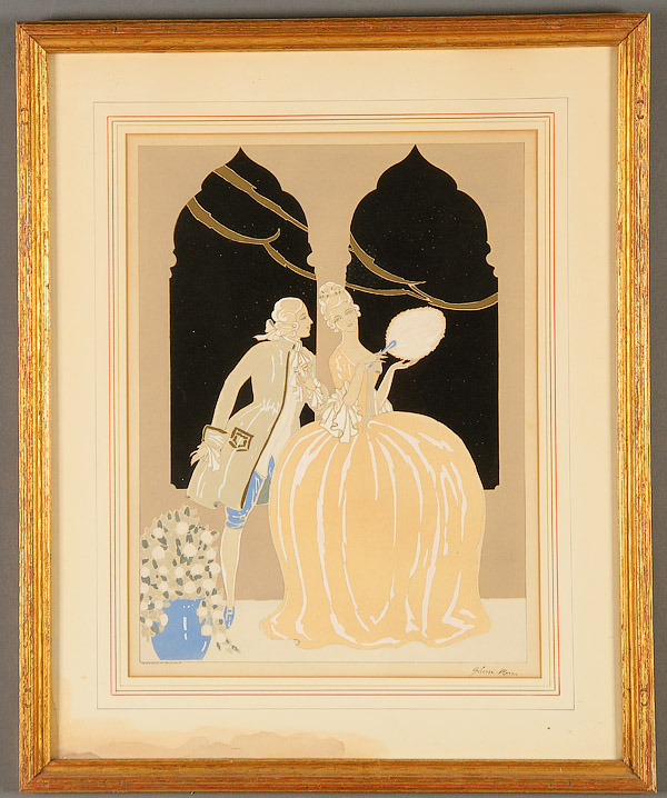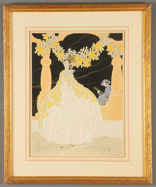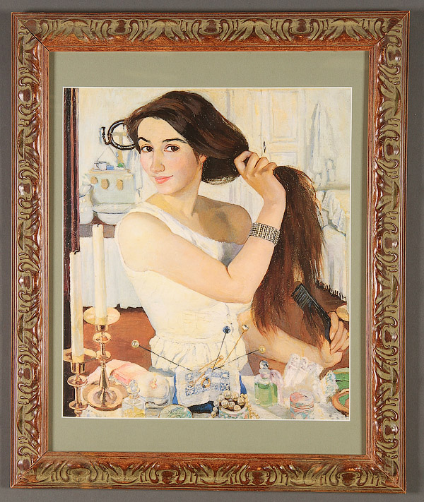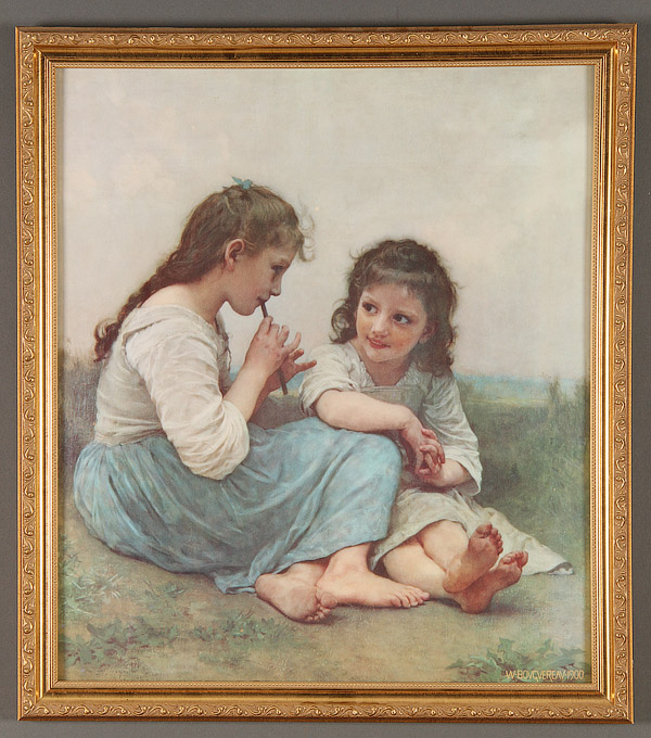 A GROUP OF 16 PRINTS, CIRCA 1880-MODERN. Comprising a pair of Art Deco Louis Icart style works, signed lower right Davanzo and Gherri Mora, image size 15.75 inches x 11.75 inches (40 x 29.8 cm) contained in matching gilt frames; Roger Chapelain-Midy (French 1904-1992), Winter Still Life, signed and numbered 1/60, 10.5 inches x 8.5 inches (26.7 x 21.6 cm); Henri Toulouse-Lautrec (French 1864-1901) Reine de Joie lithograph, 12.25 inches x 8.25 inches (31.1 x 21 cm); James L. Artig, Nautical print, 12 inches x 24 inches (30.5 x 61 cm); vintage wooded trail print, indistinguishably signed in plate lower right, image size 12.5 inches x 9.75 inches (31.8 x 24.8 cm); C.B. Newhouse (British 19th century), One Mile From Gretna, image size 11 inches x 17 inches (27.9 x 43.2 cm); William Aldophe Bougereau (French 1825-1905) Two Girls (Childhood Idyll), image size 20.25 inches x 17.75 inches (51.4 x 45 cm); Zinaida Serebriakova (Russian 1884-1967) Self Portrait: At the Dressing Table, image size 16 inches x 14 inches (40.6 x 35.6 cm); Valentin Serov (Russian 1865-1911) Girl with Peaches, image size 16 inches x 14.5 inches (40.6 x 36.8 cm); a pair of French prints A Promenade Du Soir and La Toilette, image size 12.5 inches x 8.75 inches (31.75 x 22.2 cm); a pair of prints depicting 19th century soldiers, image size 11.25 inches x 5 inches (28.6 x 12.7 cm) and a pair of prints of two guards, image size 12 inches x 9 inches (30.5 x 22.9 cm).