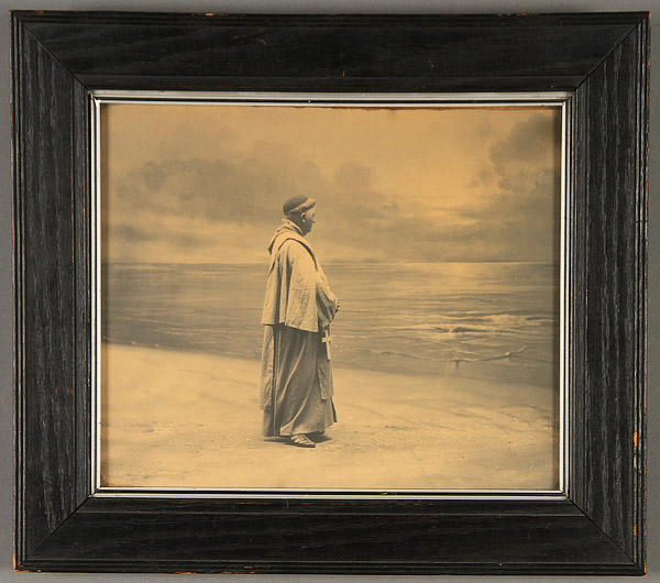 A VINTAGE ARTS AND CRAFTS SEPIA PHOTOGRAPH, CIRCA 1900. Depicting a monk along a tranquil shore at sunset, signed lower left “Copyright 1901-Baskerton (?) Gallery." 10 inches x 12 inches (25.4 x 30.5 cm), contained in an ebonized or fumed oak-glazed frame.