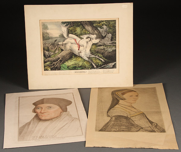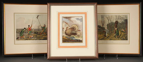 SEVEN SPORTING ENGRAVINGS INCLUDING CURRIER. Comprising a N. Currier 1846 hand colored stone lithograph "Mazeppa" small folio together with six later Maclaine reprints of cockfighting, water hen shooting and spearing the otter lithos (two plates each of Plate I and Plate II). The latter attractively framed and matted, 16 x 19 inches (41 x 48 cm).