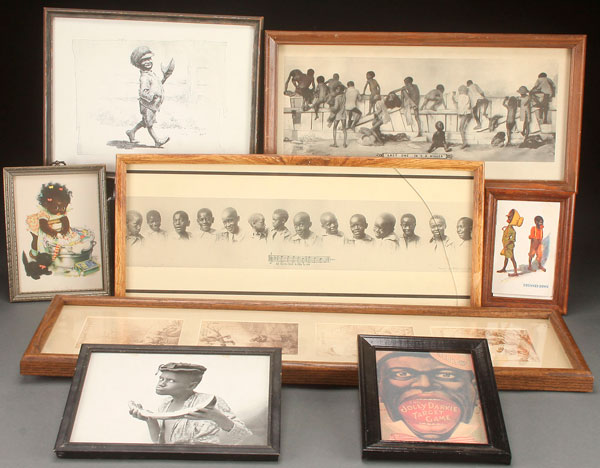 A 12 PIECE BLACK AMERICANA DECORATIVE ARTS GROUP, EARLY TO MID 20TH CENTURY. Framed prints, reprints an visual racial humor. The largest length 28.5 inches (72 cm).