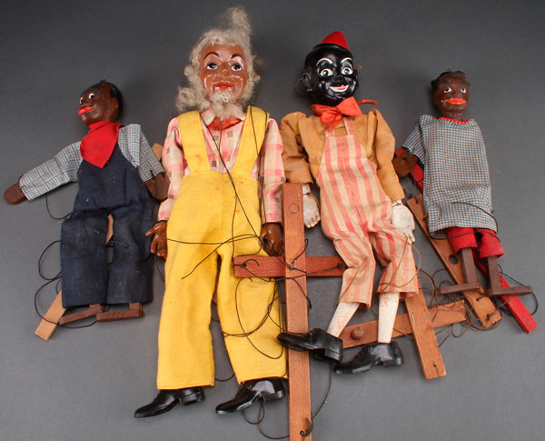 A GROUP OF FOUR BLACK AMERICANA MARIONETTE DOLLS, MID 20TH CENTURY. Comprising a Clippo type clown, a hard plastic uncle Mose, and a young girl and boy character couple. Largest 14 inches (36 cm).