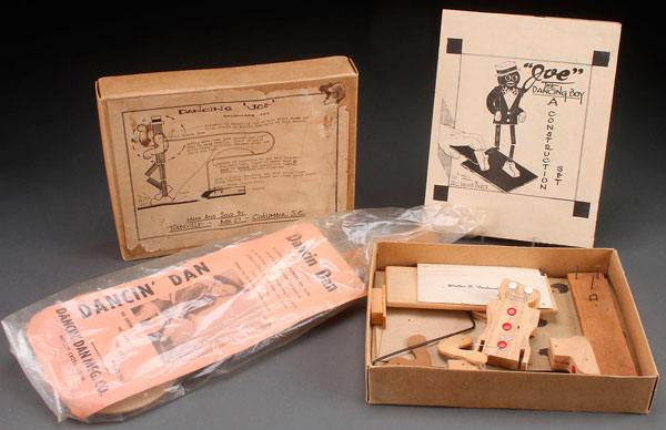 A BLACK AMERICANA DANCIN' DAN LITHOGRAPH WOOD JIGGER. In mint condition in original packaging, length 20 inches (51 cm). Together with a "Dancing Joe" wood toy construction set, in original box with instructions.