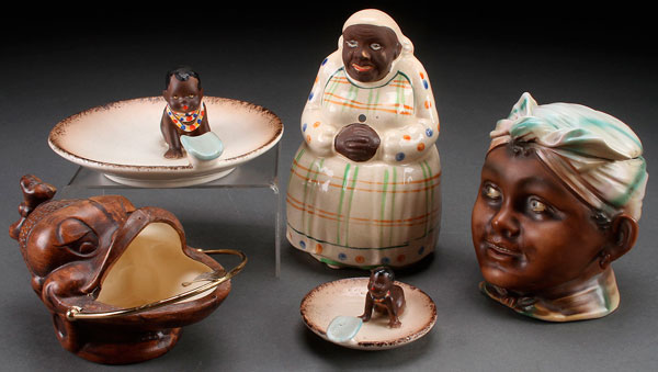 A FIVE PIECE GROUP OF BLACK AMERICANA, EARLY TO MID 20TH CENTURY. Comprising a Mammy string holder and covered tobacco jar, a Ubangi ash tray and two black baby ashtrays. The largest 6.5 inches (16.5 cm).