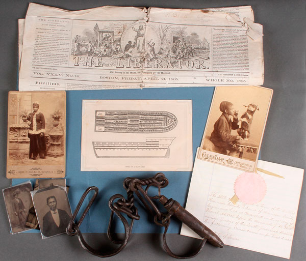 A 19TH CENTURY BLACK AMERICANA AND SLAVE RELATED GROUP. Comprising a three page hand written court indictment regarding legal proceedings against three "Freedman of Color", from the state of Texas dated 1866, with embossed district court seal; an 18th century engraved book plate illustration "Decks of a Slave Ship"; a copy of "The Liberator" newspaper for April 21, 1865; a cabinet card of a well dressed black woman, and four tin types of well dressed black men. Together with a pair of wrought iron shackles with cork screw key, probably of later make.