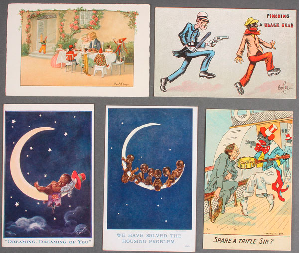 60 BLACK AMERICANA VINTAGE POSTCARDS, EARLY 20TH CENTURY. Including racial humor, artist signed, some series. In various conditions.