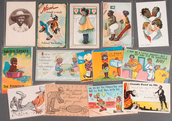 50 BLACK AMERICANA RELATED POSTCARDS, EARLY 20TH CENTURY. Some artist signed and comical racial scenes, cotton pickers and Southern plantations, a Dwig Tuck card, several souvenir booklets and more. In various condition, the majority excellent or better.