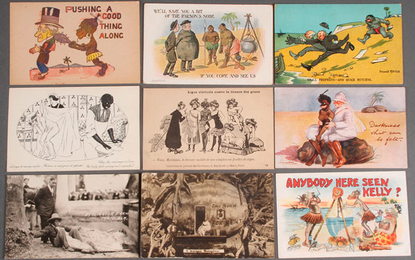 100 BLACK AMERICANA VINTAGE POSTCARDS, EARLY 20TH CENTURY. A variety of subjects and themes including racial humor, real photo exaggeration, artist signed, risqué, and cotton pickers. In various condition.
