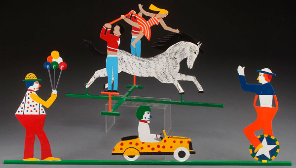 Two Circus Theme Folk Art Sculptures -depicting an acrobat horse riding team and three clowns