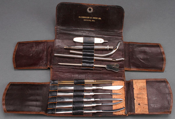 A HAUSSMANN & DUNN LEATHER CASED SURGEONS KIT, LATE 19TH CENTURY. 1880's surgeon's kit, Haussmann & Dunn Co. Length 5.5 inches (14 cm) closed.