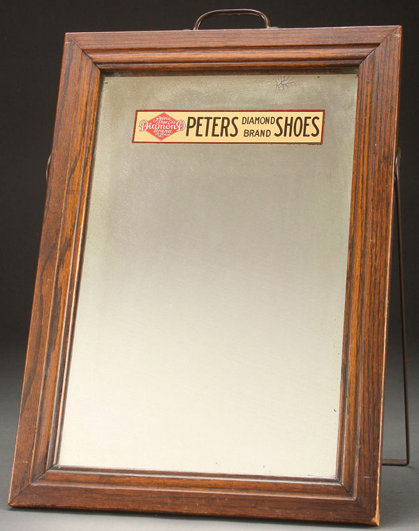 A PETERS DIAMOND SHOES ADVERTISING MIRROR, EARLY 20TH CENTURY. Free standing floor mirror in oak frame. Height 20.5 inches (52 cm).