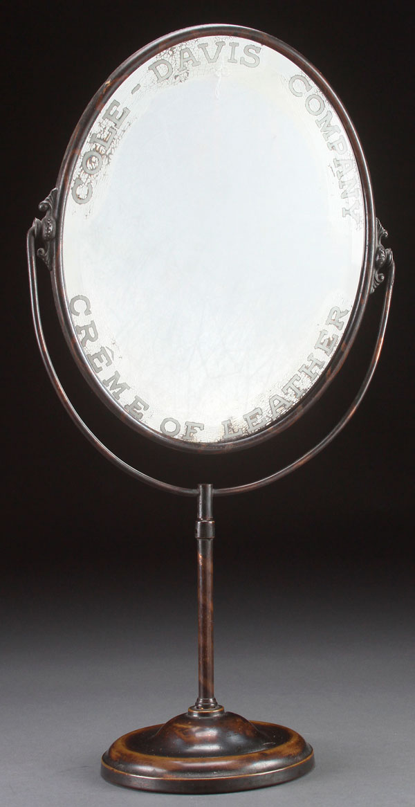 A FINE CRÈME OF LEATHER ADVERTISING MIRROR, EARLY 20TH CENTURY. For the Cole-Davis Company, beveled oval glass in a patinated brass stand, adjustable height, marked "American Specialty Chicago". Height 24 inches to 29 inches (61-74 cm).