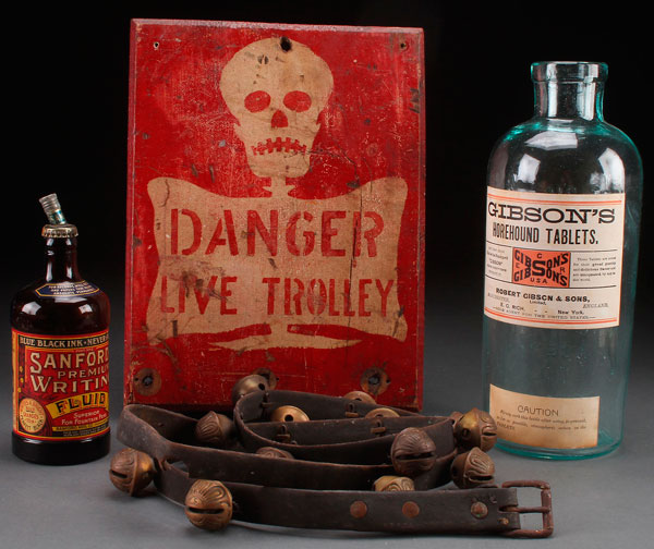 A LATE 19TH/EARLY 20TH CENTURY DECORATIVE PRIMITIVES GROUP. Comprising a polychrome wood electric trolley warning sign, a Gibson's Horehound Tablet jar, A Sanford's ink bottle, and a 14 brass bell string. Largest height 13 inches (33 cm).