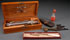 A WILLIANS 19TH CENTURY LEATHER CASED BLEEDER TOOL. Together with two oak cased Viking syringes, a strychnine poison bottle with devil's skull figural corkscrew, and a mother of pearl handled ink pen. Largest length 8.25 inches (21 cm).