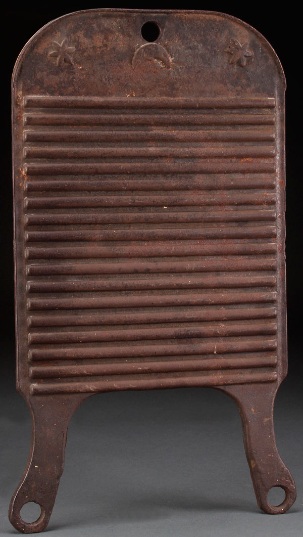 A RARE CAST IRON WASH BOARD, LATE 19TH CENTURY. With embossed moon and star decoration. Height 22 inches (56 cm).