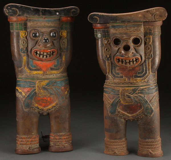 TWO RARE HEYWOOD-WAKEFIELD FOR FISHER THEATER MAYAN GOD SEAT ENDS, CIRCA 1930S. Polychrome cast iron, one with original glass illuminated eyes, probably salvaged from the Fisher Theater, Detroit, MI. Height 24 inches (61 cm).