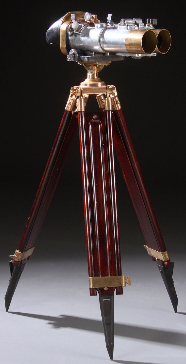 A PAIR OF GERMAN MILITARY WWII FLAK BINOCULARS ON TRIPOD. By SRPI Puteaux, Jumelle S. 10 x 60 (54), Type G, No. 11. Aluminum and brass raised on a mahogany and brass extended tripod stand. Length 19 inches (48.5 cm), height as illustrated 46 inches (117 cm).
