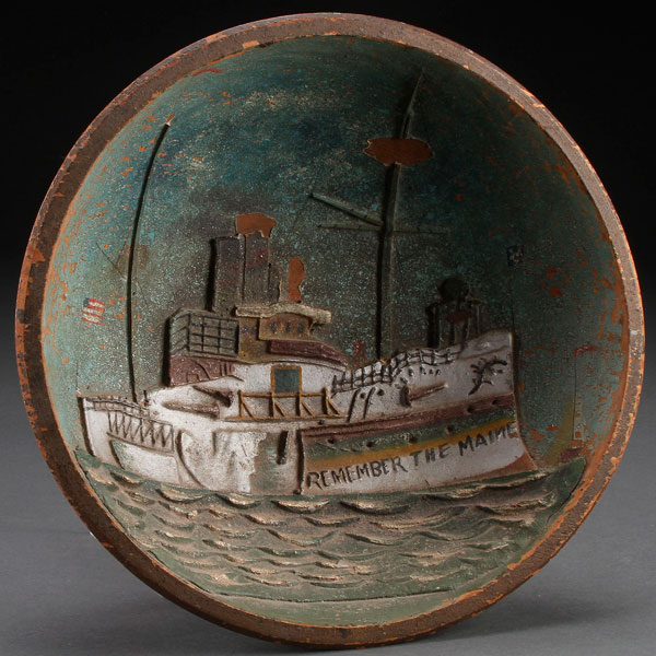A REMEMBER THE MAINE CARVED POLYCHROME AND EMBOSSED COMPOSITION WOOD BOWL. Some losses. Diameter 12.75 inches (32 cm).