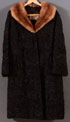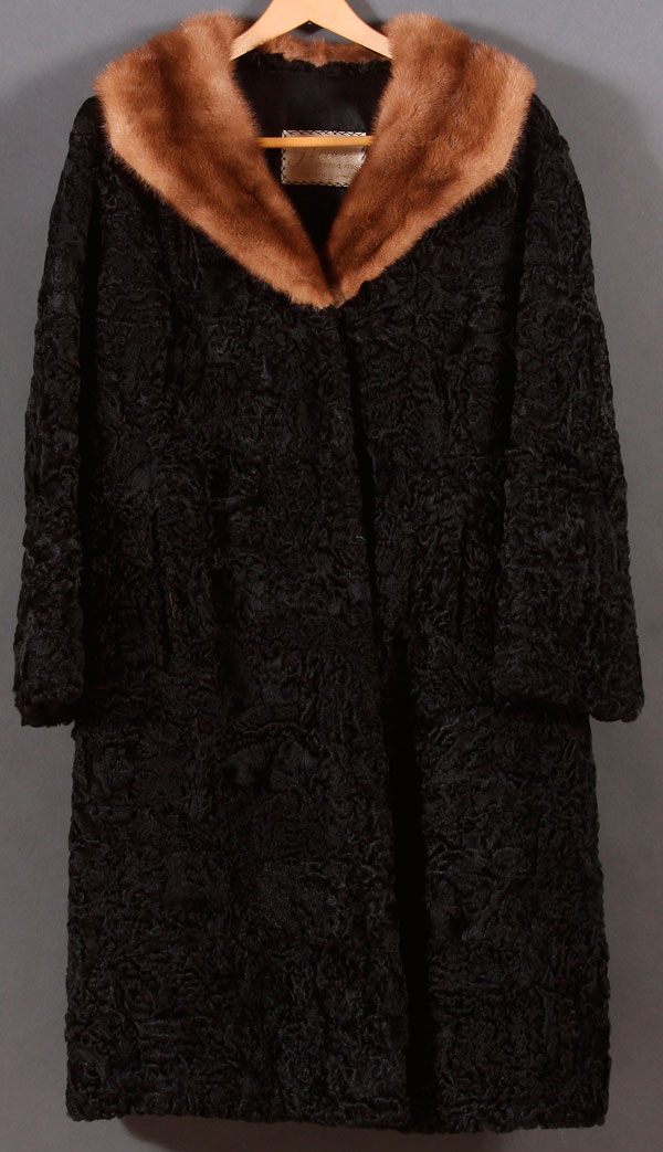A LADIES BLACK LAMB FUR COAT, MID 20TH CENTURY. With natural mink collar and labeled "Petra's Custom Furs, Waterloo, Iowa". Length 40 inches (102 cm). Approximate size medium.