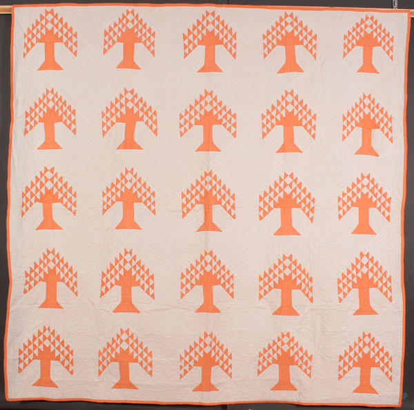 A VICTORIAN HAND STITCHED AND PIECED QUILT, LATE 19TH/EARLY 20TH CENTURY. In a tree of life pattern, quilted with interlocking oval designs. 80 inches (204 cm) x 81 inches (206 cm).