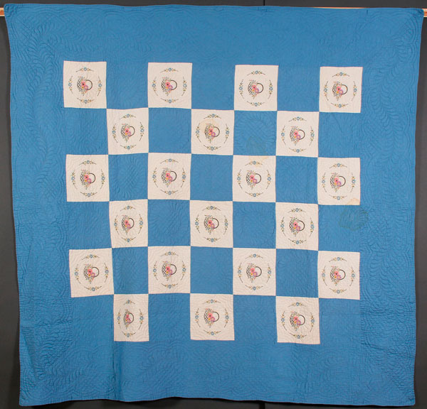 A VERY FINE AMERICAN HAND STITCHED AND EMBROIDERED QUILT, 20TH CENTURY. With embroidered blocks of floral baskets on a blue ground with quilted rosettes and plumes. 79 inches x 77 inches (201 x 196 cm).