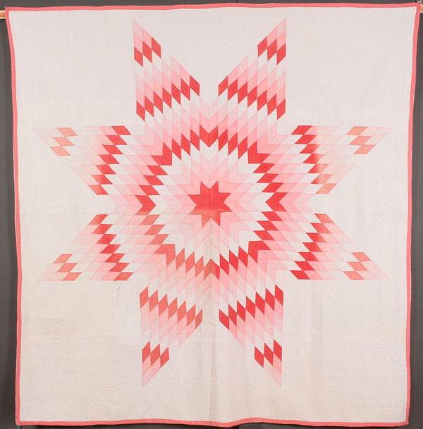 AN AMERICAN HAND STITCHED AND PIECED QUILT, EARLY 20TH CENTURY. Texas star pattern on a finely quilted ground with field of rosettes and other quilted designs. 75 inches x 79 inches (191 x 201 cm)