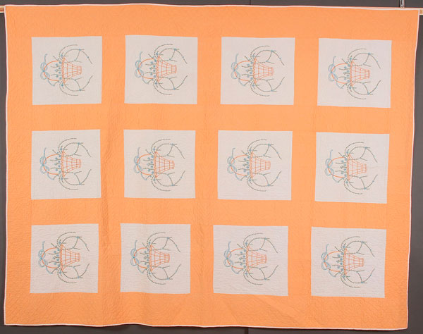 A VERY FINE AMERICAN HAND STITCHED AND EMBROIDERED QUILT, EARLY 20TH CENTURY. Comprising twelve embroidered floral basket panels on a peach colored ground with quilted patterns. 92 inches x 72 inches (234 x 183 cm).