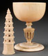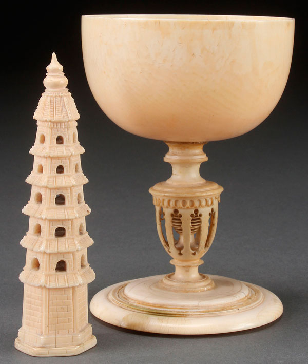 A EUROPEAN CARVED IVORY GOBLET, LATE 18TH CENTURY. With reticulated stem base, height 4.75 inches (12 cm). Together with an oriental carved ivory miniature stupa, height 4.25 inches (11 cm).