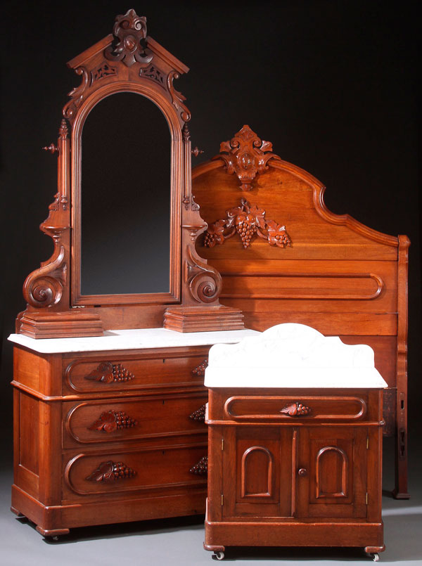 A VICTORIAN WALNUT THREE-PIECE BEDROOM SUITE, CIRCA 1875. Comprising a three-drawer dresser with marble top, height 86.5 inches (220 cm), width 42 inches (107 cm), depth 19 inches (48 cm); a one-drawer commode with marble top and scalloped backsplash, height 34.5 inches (87.75 cm), width 28 inches (71.25 cm), depth 16 inches (40.75 cm); and an associated three-quarter size headboard and footboard, height 68 inches (173 cm), width 58.5 inches (149 cm). Each piece ornamented with fingermold carving and applied carved fruit clusters. Heights 68 inches, 85 inches and 31 inches.