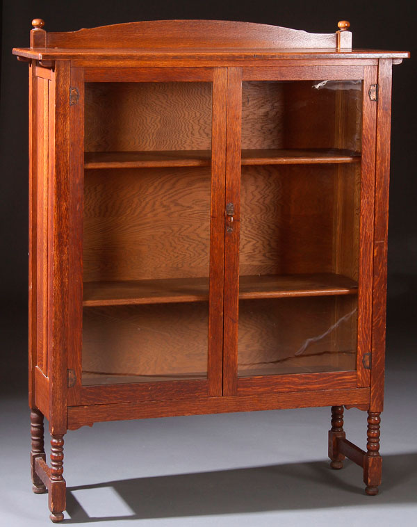 AN OAK ARTS AND CRAFTS STYLE TWO DOOR BOOKCASE, EARLY 20TH CENTURY. Raised on turned legs with two adjustable shelves. Height 58 inches (147.5 cm), width 45 inches (114.5 cm), depth 15.25 inches (39 cm).