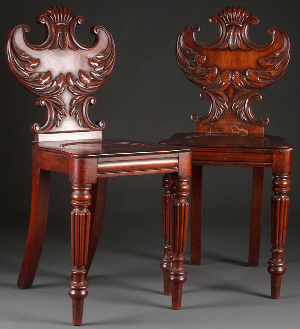 A PAIR OF ENGLISH WALNUT CARVED BACK HALL PORTERS, EARLY TO MID 20TH CENTURY. With scrolled foliate carved backs. Height 33 inches (84 cm), width 15 inches (38 cm), depth 17 inches (43 cm).