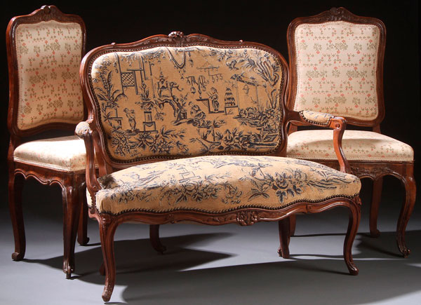 A PAIR OF LOUIS XVI PERIOD CARVED WOOD SIDE CHAIRS. With later floral upholstered seats, height 40 inches (101.5 cm), width 21 inches (53.5 cm), depth 16 inches (40.75 cm). Together with a Louis XVI style settee with blue/grey scenic needlepoint seat and back cushion, height 36 inches (91.5 cm), width 41 inches (104 cm), depth 26 inches (66 cm).