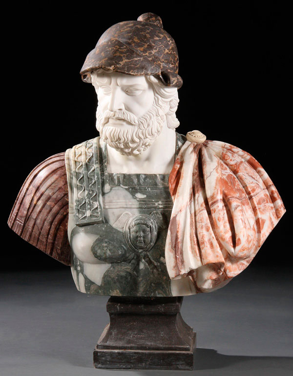 A LARGE NEOCLASSICAL CARVED MARBLE BUST OF A ROMAN STATESMAN, 20TH CENTURY. Fully carved in a round life-sized figure, the head in white marble with a mottled gray marble helmet, set in a carved marble shoulders and chest with conforming armor and raised on a square plinth. Height 38 inches (96.5 cm).