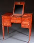 AN ENGLISH REGENCY INLAID MAHOGANY "BEAU BRUMMEL" DRESSING VANITY, EARLY 19TH CENTURY. With hinged lid containing a glazed mirror, five drawers and a pull-out tablet, raised on inlaid tapering legs, in various matched veneers and satinwoods. Some losses and disrepair. Height 29.5 inches (75 cm), width 32.25 inches (82 cm), depth 18.25 inches (46.5 cm).