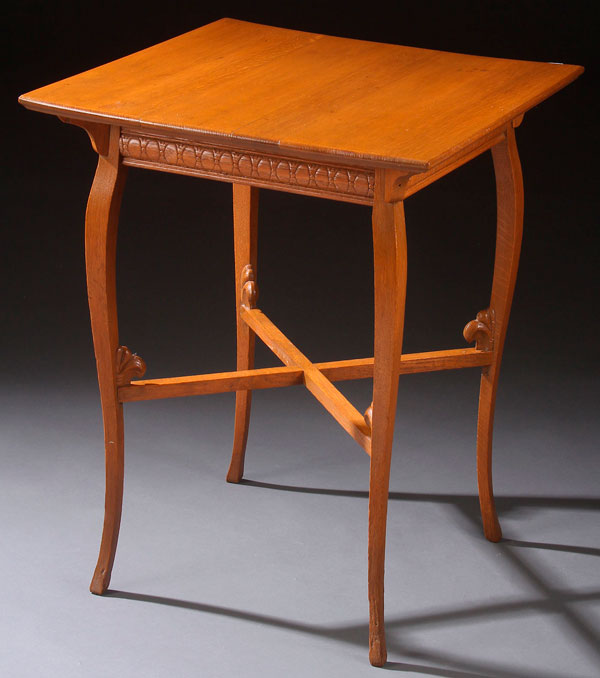 A VICTORIAN OAK PARLOR TABLE. With squared top, raised on saber form legs. Height 29.5 inches (74.5 cm), 23.5 inches (60 cm) square.