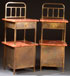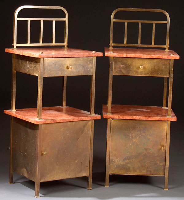 A PAIR OF ENGLISH ARTS AND CRAFTS BEDSIDE TABLES, CIRCA 1900. Brass, with rouge marble tops and shelf. Height 40 inches (102 cm), width 16.5 inches (42 cm), depth 15 inches (38 cm).