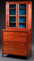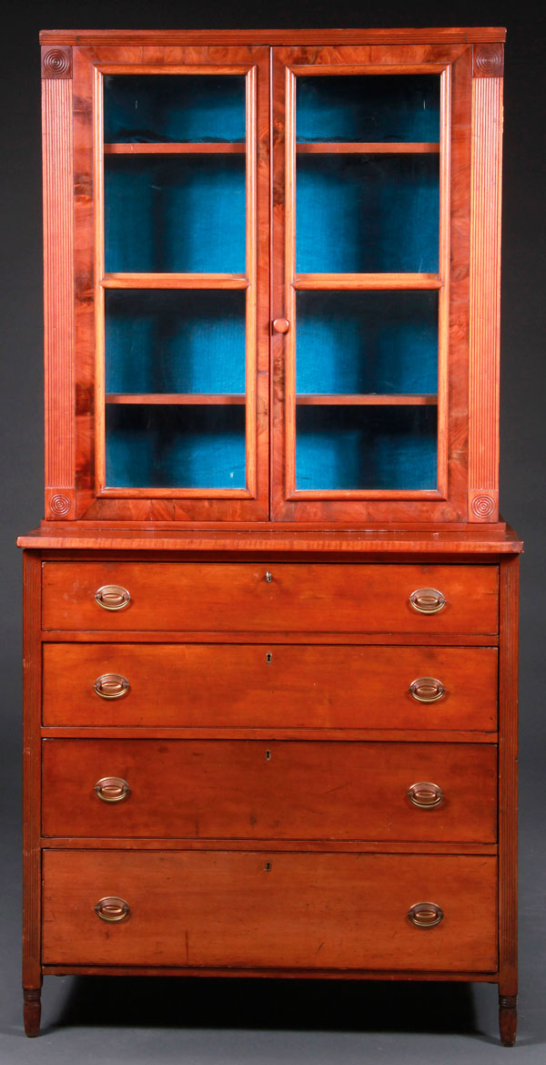 A FEDERAL CHERRY WOOD FOUR DRAWER CHEST WITH BOOKCASE TOP. With fluted supports raised on turned legs and bookcase doors with flame mahogany fronts. Height 84 inches (213.5 cm), width 40.75 inches (103.5 cm), depth 20.25 inches (51.5 cm).