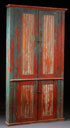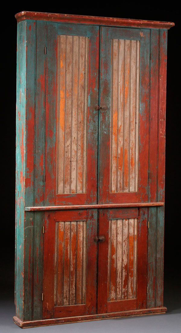 A 19TH CENTURY POLYCHROME PINE CORNER CUPBOARD. With wainscot panels, two elongated drawers over two lower doors, retaining original greenish-blue and cream milk paint over a stained cherry and honey maple finish. Height 73 inches (185.5 cm), width 40.25 inches (102 cm), depth 25.25 inches (65 cm).