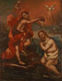 A CARVED GILT WOOD TAOS STYLE FRAME, CIRCA 1910. Opening size 19.25 inches x 15.25 inches, containing a provincial Spanish Colonial painting of the Baptism of Christ, probably 19th century.