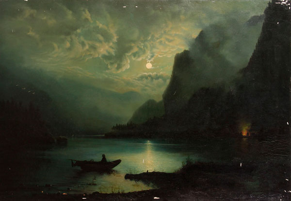 A GROUP THREE HUDSON RIVER SCHOOL STYLE PAINTINGS, AMERICAN CIRCA 1870-1910. Comprising an expansive landscape with cows watering, oil on canvas laid down signed C. Raymond, 18.5 inches x 32.25 inches, unframed; together with a fall lakeside landscape, oil on canvas laid down, unsigned, 21.5 inches x 19.25 inches, unframed; and a large nocturnal moonlit fishing scene, oil on canvas laid down, 42 inches x 60 inches, unframed.