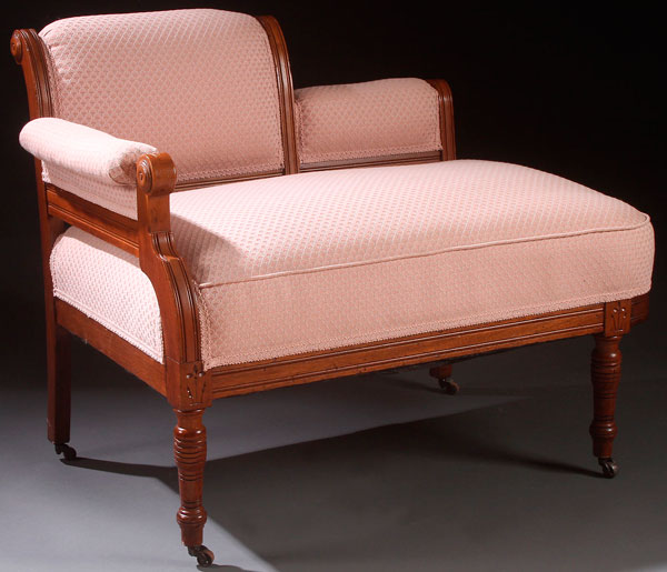 AN VICTORIAN EASTLAKE WALNUT UPHOLSTERED LOUNGE. Height 29.5 inches (75 cm), width 36.5 inches (93 cm), depth 24 inches (61 cm).