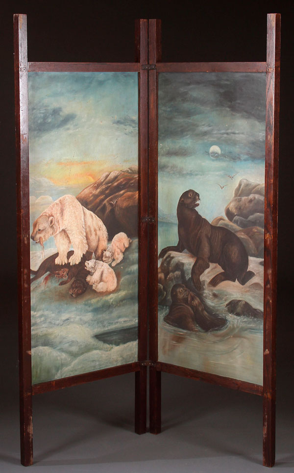 A VICTORIAN SCENIC DECORATED FOLDING SCREEN. Comprising two panels, each painted with northwest coast animal scenes of polar bear and seals. The verso with floral still life's. Contained in oak frames. Total height 71.5 inches (181.5 cm), panel height 49.5 inches (126 cm)width of panels 24.5 inches (62 cm).