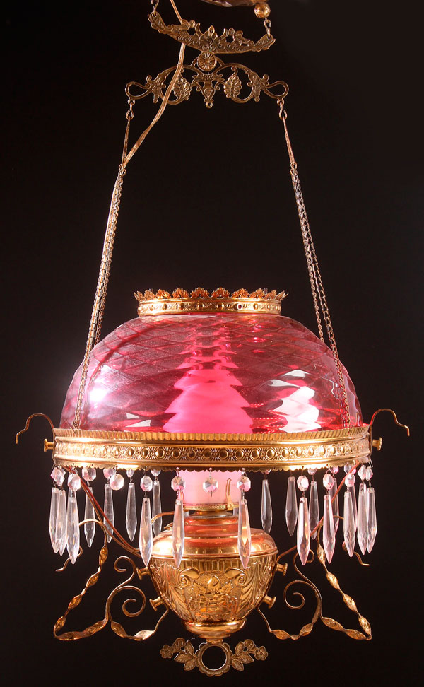 A VICTORIAN CRANBERRY GLASS PARLOR LAMP. With diamond quilted shade in a burnished brass frame with embossed font. Electrified. Height 34 inches (86.4 cm).