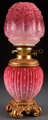 A VICTORIAN PARLOR LAMP. With an etched cranberry satin shade on an enameled glass base with gilt bronze mounts. Electrified. Height 20 inches (50.5 cm).