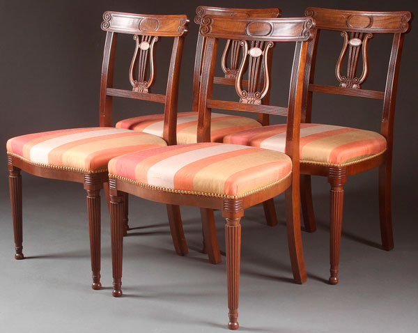 A GROUP OF FOUR FEDERAL REVIVAL CARVED MAHOGANY SIDE CHAIRS. Of good quality with lyre backs. Height 34.25 inches (87 cm).