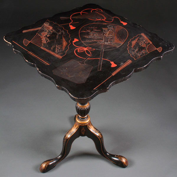 A VICTORIAN GILT DECORATED AND BLACK LAQUER TILT TOP TABLE. With Japanese motif. Height 27.5 inches (70 cm), top 21.75 inches (55 cm) square.