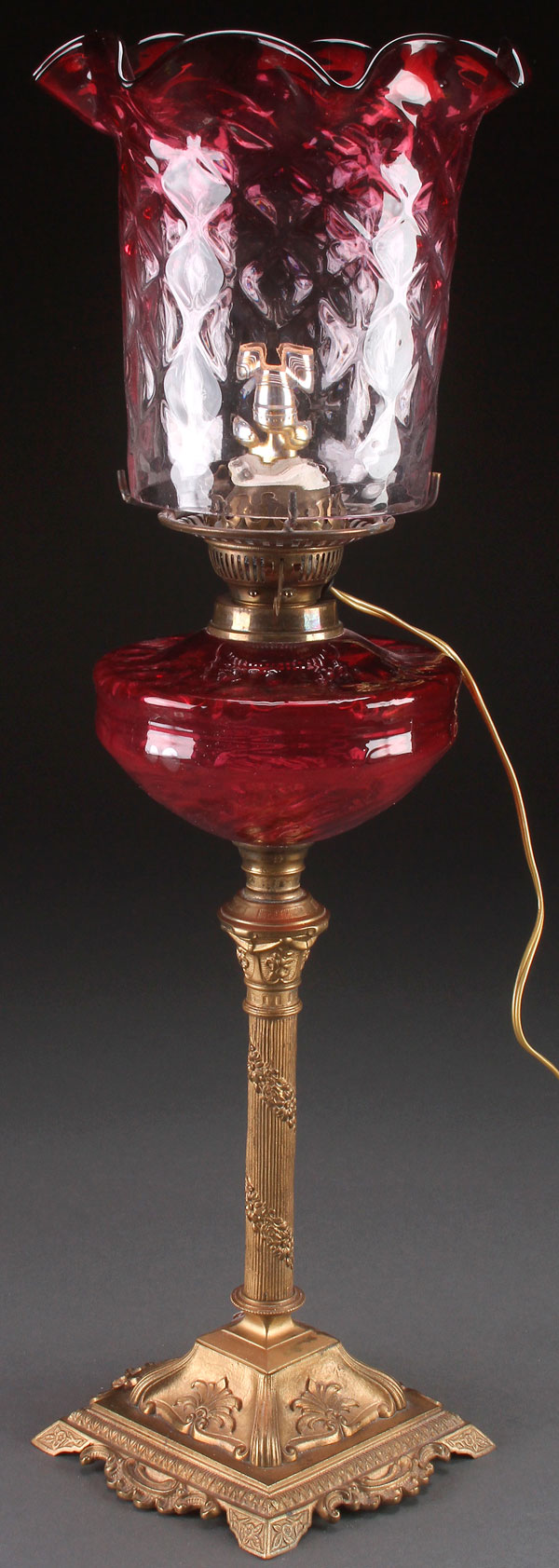 A VICTORIAN PARLOR LAMP. With cranberry font and D.Q. cranberry shade on a gilt bronze candlestick base. Electrified. Height 27.5 inches (70 cm).