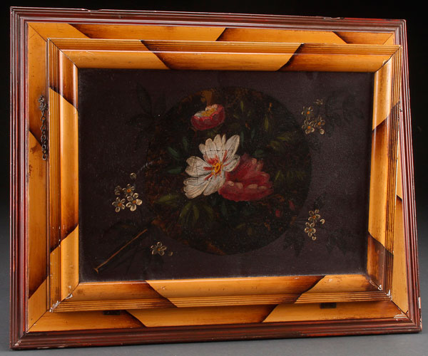A VICTORIAN POLYCHROME DECORATED WALL POCKET. With grain painted frame surrounding a floral still life. 15.75 inches x 19.75 inches (40 x 50 cm).