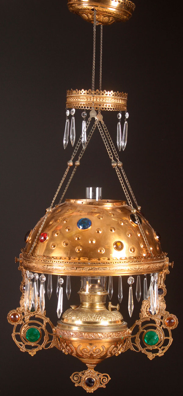 VICTORIAN HANGING PARLOR LAMP, CIRCA 1890. Polished brass frame set with green and amber jewels supporting a matching brass shade set with blue and red jewels. Height 40 inches (101.5 cm).